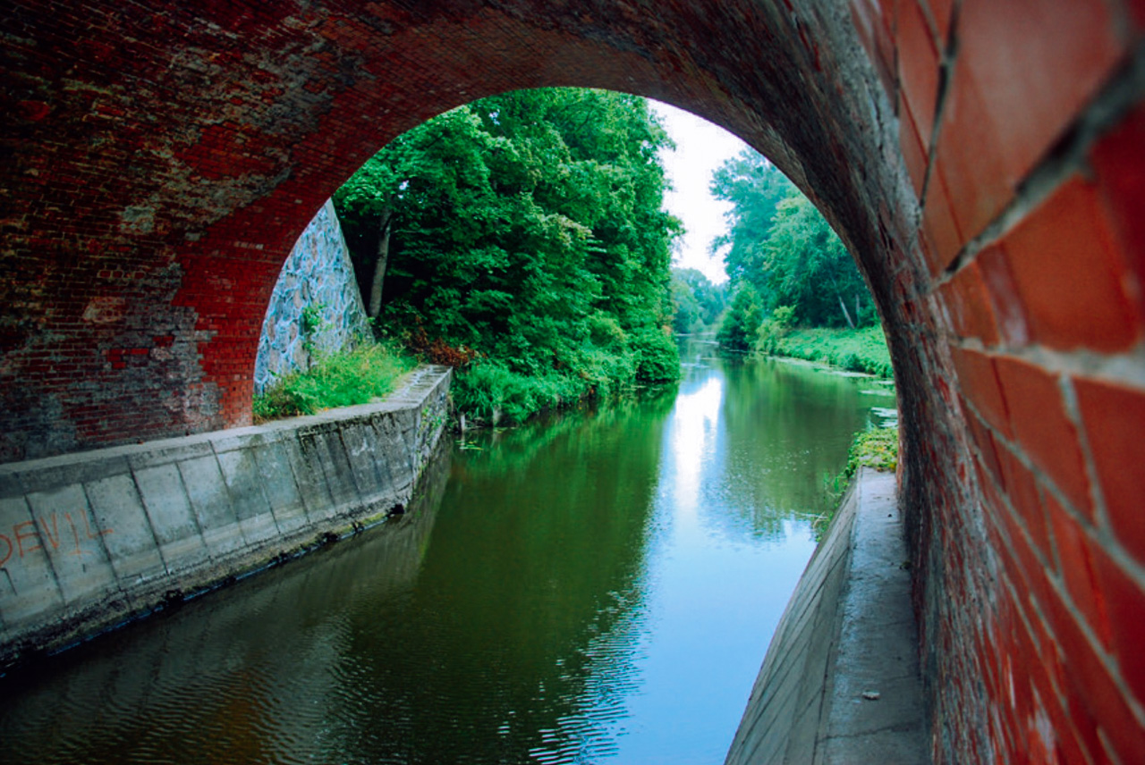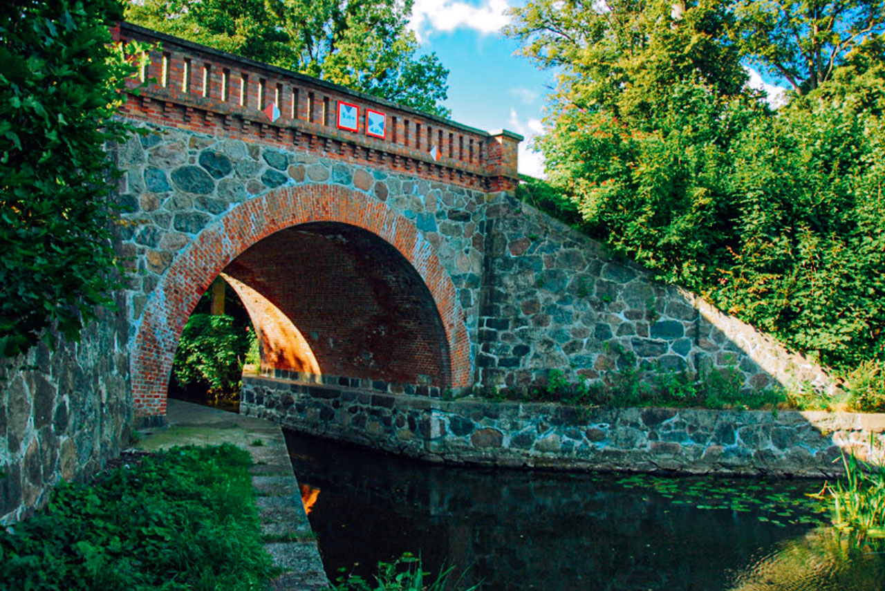 | 0,47 | Stalowy most z 1908 roku w ciągu traktu Ostróda-Elbląg, wybudowany w miejscu kamiennego mostu z 1849 r., zachowano w pełni oryginalną konstrukcję. Za nim wrota bezpieczeństwa „Liwa”. |